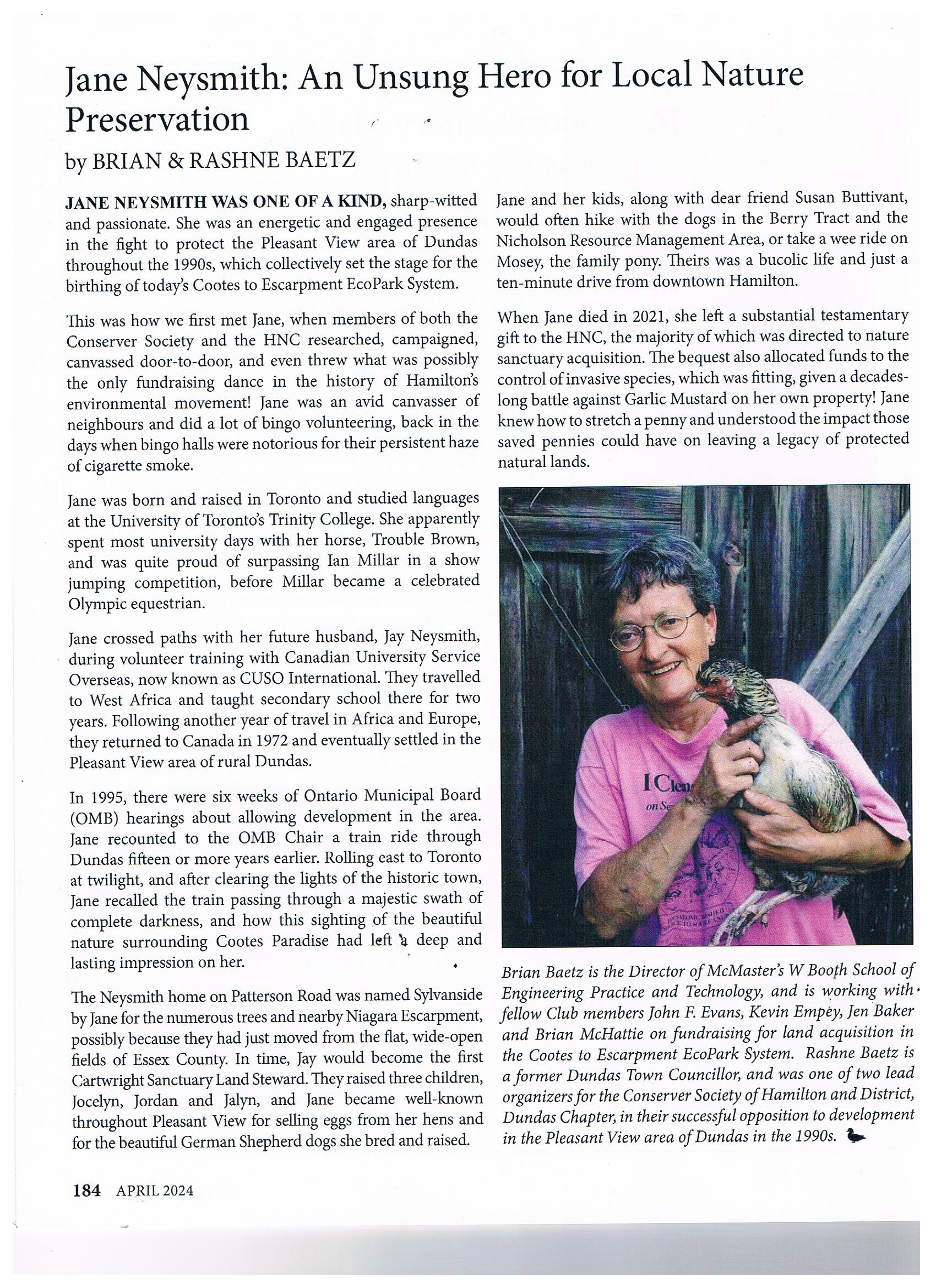 For 30 years, my family has been involved with the Dundas Chapter of the Conservers Society of Hamilton and District in the preservation of the Pleasant View lands in Dundas, which are the open space connectors between Cootes Paradise and the Niagara Escarpment. This has evolved to be known as the Dundas EcoPark, which is a significant component of the broader Cootes to Escarpment EcoPark System. The work is ongoing, but with the vision and support of the Royal Botanical Gardens, the Hamilton Conservation Authority, the City of Hamilton, Conservation Halton, Hamilton Naturalists Club and countless locally-based individuals, this has become a legacy project with very positive benefits for downstream generations.
